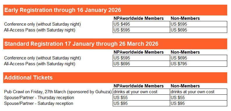 - For cancellations received beginning 1st March 2026, no refunds will be provided (exceptions considered for documented illness or emergency minus a USD $50 processing fee). NPAworldwide will offer a credit for the value of the purchased ticket (minus the USD $50 cancellation processing fee) for any NPAworldwide future meeting attended within 12 months of the initial purchase.